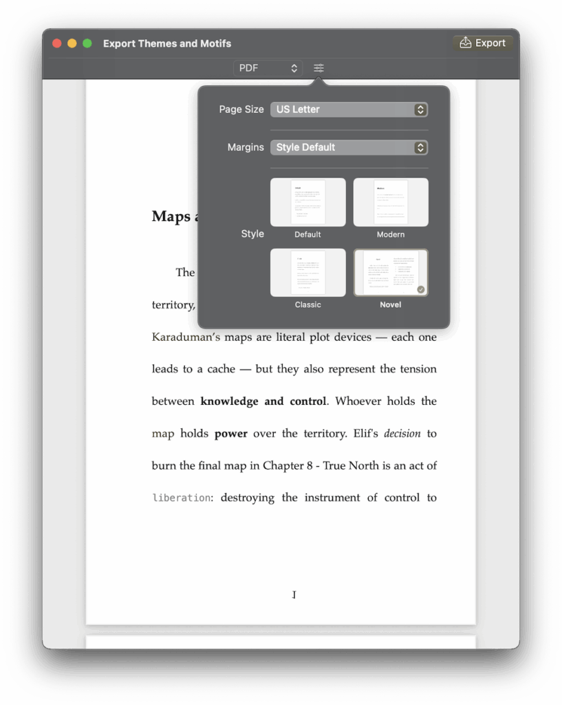• Added Custom Export Styles for HTML, ePub, and PDF (iOS + macOS)