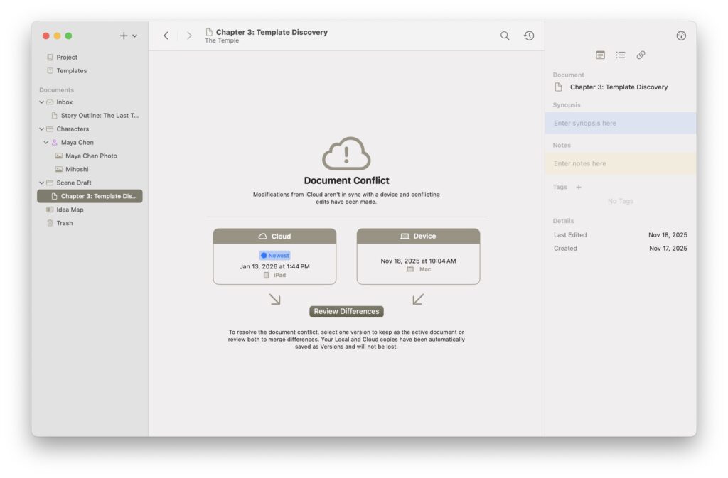 Sync just happens. iCloud keeps your Mac, iPad, and iPhone in perfect sync. Start writing anywhere, continue everywhere. I built thoughtful conflict resolution so that if the same document gets edited on two devices, your work is always protected. Find something that inspires you on the go? Snap a photo on iPhone and pick it up on your Mac. The goal is to be able to work as inspiration hits.