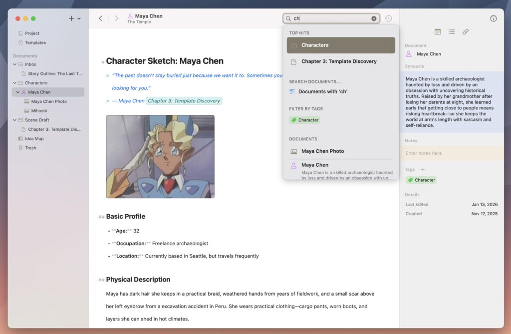 I wanted everything in one place. Documents, folders, canvases, images, PDFs, web pages, and audio files all live together in a single project hierarchy. You can nest anything inside anything — a chapter can hold its own research notes, a character profile can contain reference images. Your project structure mirrors how you actually think, not how software usually assumes you should.